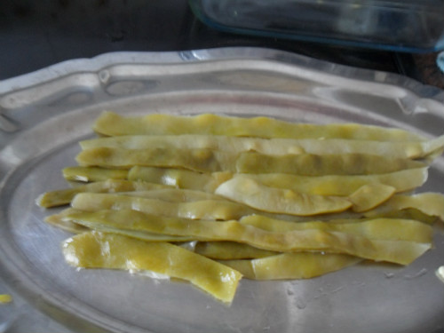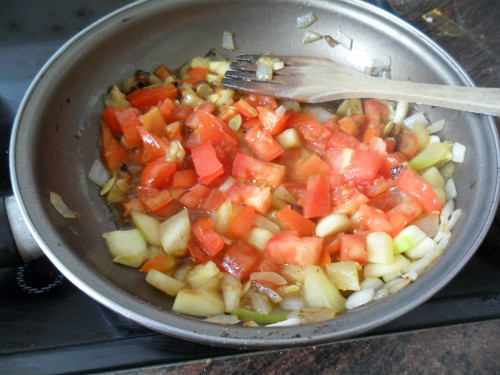 cocer las judías verdes y reservar, en una sartén poner a calentar el aceite y echar la cebolla, y el calabacín, hacerlos durante 10 minutos a fuego lento, echar el chorrito de vino blanco y cuando se evapora añadir el tomate, tenerlo otros 10 minutos.