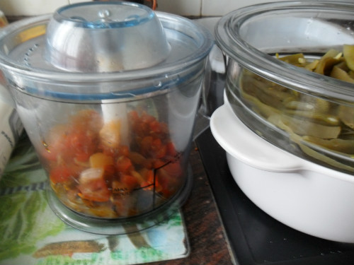 triturar la mezcla de verduras a excepción de las judías verdes en la batidora preparando una salsa