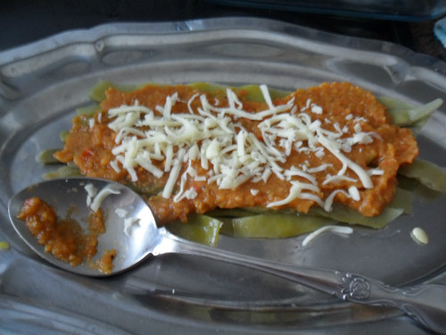 ir añadiendo capas, judías , salsa de verduras y queso rallado, otra capa de judías, salsa y queso rallado , así sucesivamente procurando acabar con la salsa de tomate y queso