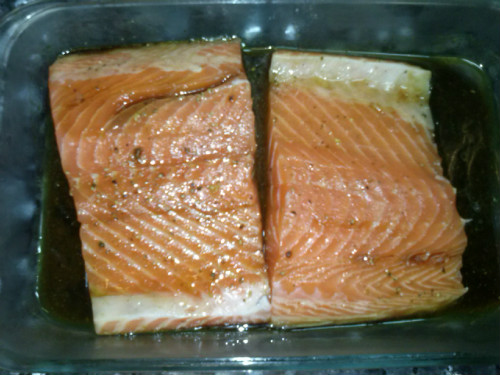 Salpimentar los lomos de salmón, agregar el aderezo y dejar marinar entre 30 minutos y 1 hora.