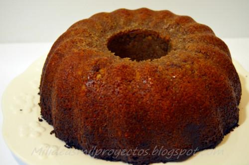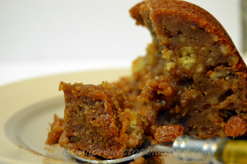 En primer lugar trocearemos las nueces y en un BOL grande vamos mezclando todos los ingredientes, primero pondremos el bizcocho junto con los huevos y mezclamos, luego el resto de los ingredientes y mezclamos bien, pulverizamos con el desmoldante un molde a nuestra elección y le ponemos la mezcla, precalentamos el horno a 200ºC e introducimos el molde por un tiempo aproximado de 40 minutos, comprobaremos que esta hecho, cuando al introducir una aguja, esta nos sale limpia