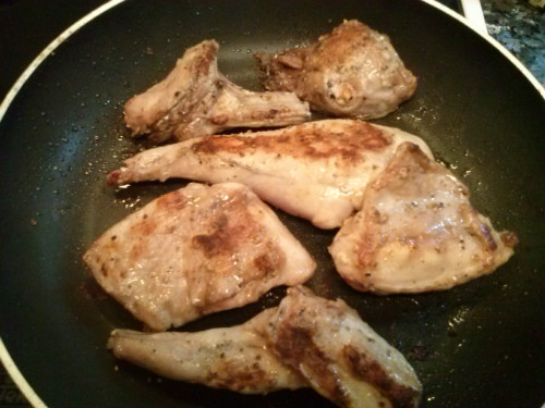 Salpimentar el conejo, dorarlo en un poco de aceite, retirar y reservar.