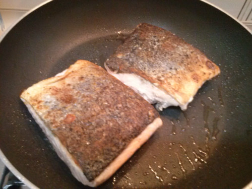 Primero a fuego fuerte 1 minuto por la parte de la piel para que quede crujiente.