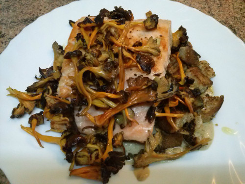 Añadir los camagrocs o (trompetas amarillas) y pochar hasta que las setas queden blanditas.
