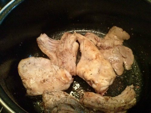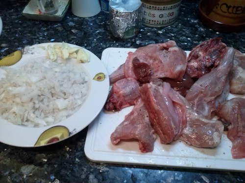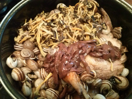 Añadir el conejo, los caracoles y las setas y remover para mezclar bien.