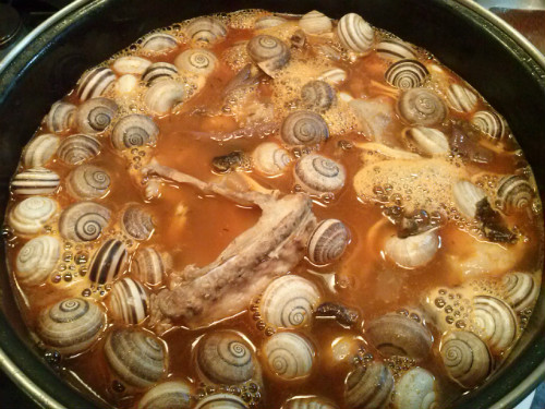 Añadir sal sólo al conejo y al tomate frito. El caldo y los caracoles ya son bastantes salados...