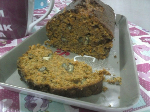 En un bol echamos las harinas, el impulsor, la sal y el bicarbonato, lo mezclamos bien, tamizamos y añadimos a la mezcla anterior. Por último añadimos la zanahoria y las nueces, las cuales las habremos rebozado previamente en harina para evitar que se vayan al fondo del molde.
