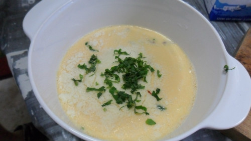 En un bol, batir los huevos, con el vaso de leche , la albahaca partida muy fina y el queso, añadir sal al gusto