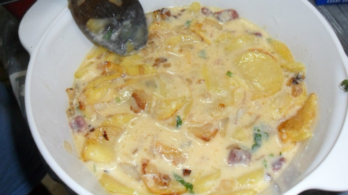 mezclar todo con la patata y la cebolla previamente escurrida
