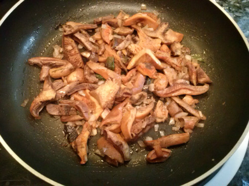Salpimentar los níscalos y las cebollas y saltear en un poco de aceite durante 10 minutos a fuego medio.