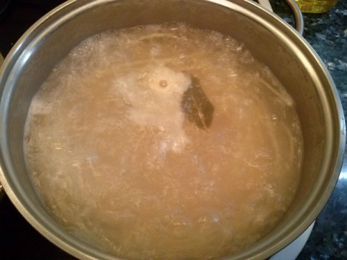 Mientras tanto cocer la pasta en abundante agua salada con una hoja de laurel el tiempo que indique las instrucciones del paquete.