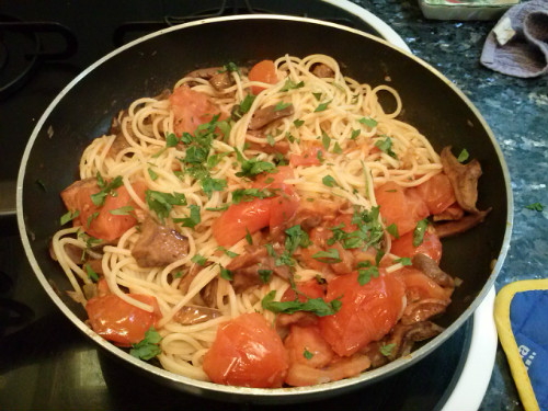 Volvemos a la sartén, quitamos la rama de perejil y la tiramos, añadimos la pasta y removemos un par de minutos a fuego suave.
