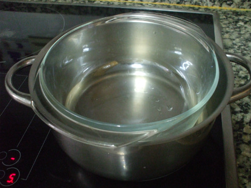 Poneos al fuego una cazuela con agua y un bol para el baño maría, quitar el bol para que se caliente el agua,
