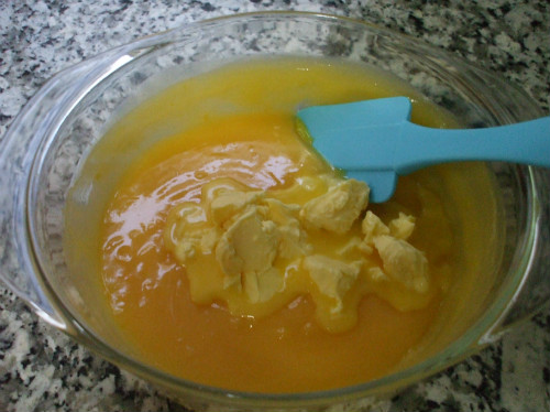 Incorporar la mantequilla hecha trozos en la crema, batir con una espátula limpia hasta que luzca homogénea.