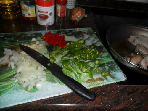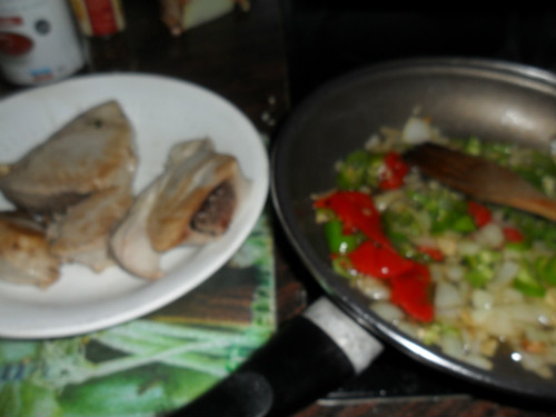 poner una sartén al fuego con aceite, dorar el atún por los dos lados, de mientras picar las verduras a taquitos pequeños
