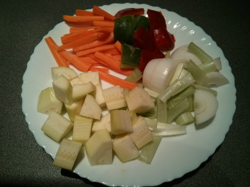 Lavamos, pelamos y cortamos al gusto (láminas o tacos) todas las verduras.