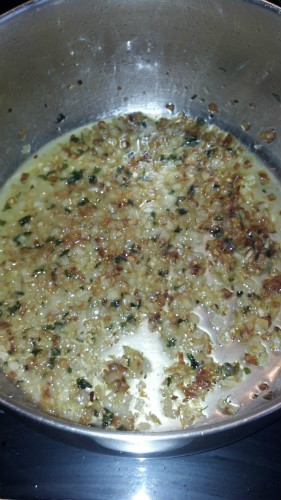 picar la cebolla el ajo y el perejil ,poner a dorar en una olla,