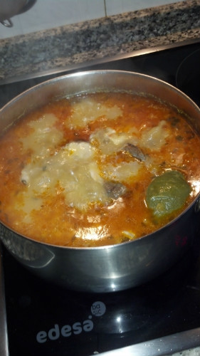 añadir un chorrito de vino blanco y el pimenton y rehogar bien todo ,añadir agua hasta cubrirlas.dejar cocer unos 20 minutos,y añadir el golondru,otros 15 minutos y añadir la sal.