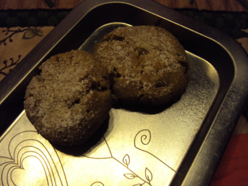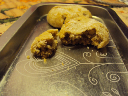Por último hacemos pequeñas bolitas y las aplastamos ligeramente y las ponemos en una bandeja de horno forrada con papel de hornear, convenientemente separadas. Horneamos unos 20 minutos o hasta que se estén dorado las galletas. Al sacarlas las espolvoreamos con azúcar glas.