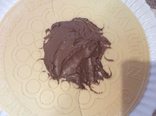 Colocamos otra oblea sobre la primera y la cubrimos completamente con Nutella. Realizamos este paso hasta conseguir la altura deseada cubrimos completamente por los laterales.