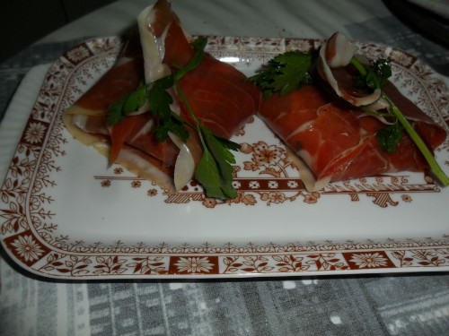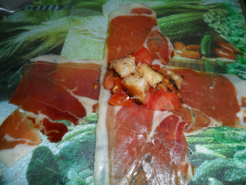 cruzar dos lonchas de jamón para preparar los paquetitos, colocar en el centro la mezcla de pan y tomate, no hace falta echarle sal ya que tiene suficiente el jamón,