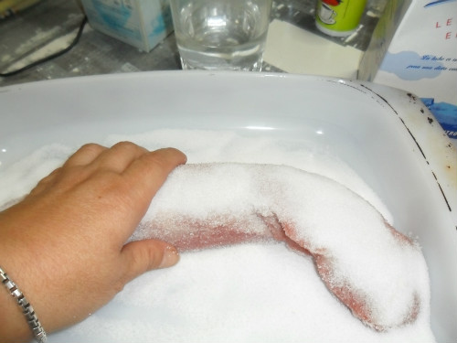romper la costra de sal y hacer rodajas el solomillo