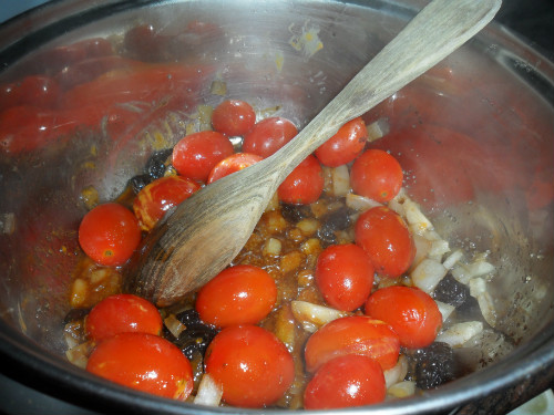 en una sartén al fuego poner el azúcar, la cebolla picada fina, los tomates cereza y las uvas pasas a fuego suave cuando tome un color dorado el azúcar mezclarlo con el vasito de agua y de vinagre,