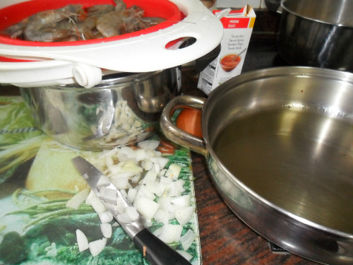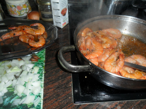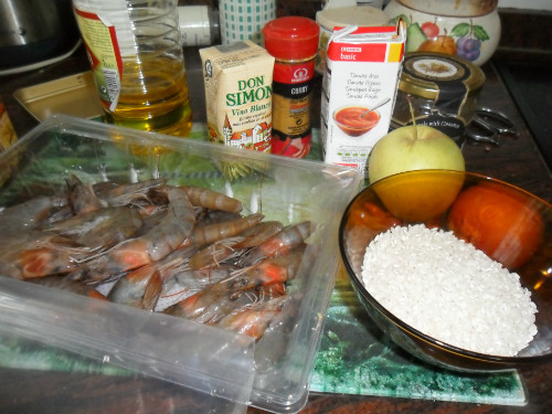 preparar los ingredientes, si los langostinos son congelados descongelarlos antes, si son frescos, lavar y escurrir