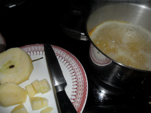 poner a hervir, 2 tazas de agua con salo, pelar la manzana y cortarla a trocitos, cuando hierva el agua echar el arroz, una cucharadita de curry y añadir los trozos de manzana, cocer todo durante 15 minutos y reservar