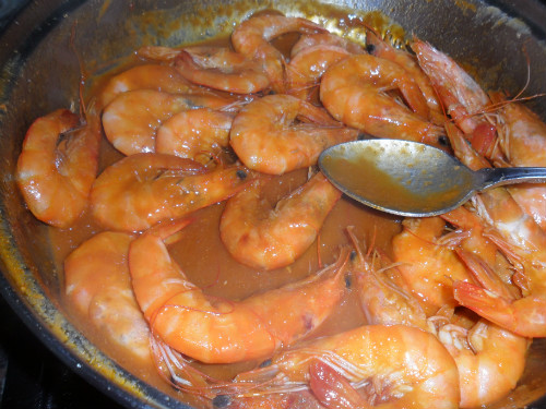 en el mismo aceite que se han frito los langostinos, echar la cebolla picada, añadir la otra cucharadita de curry, el tomate y la mermelada, pocharla unos minutos y añadir el vino blanco, dejar hervir y reducir la salsa a fuego lento unos 10 minutos, volver a meter en la salsa los langostinos y mezclarlos bien. Servir en cada plato 6 langostinos por persona junto con una tacita de arroz