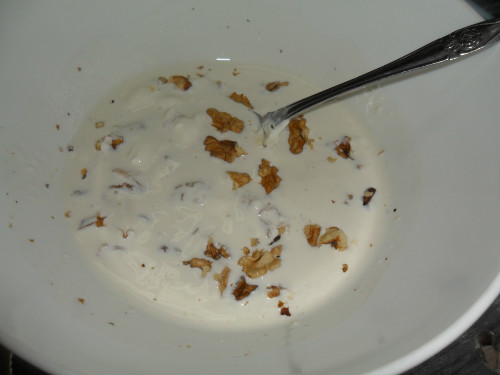 En un bol, mezclar las 4 cucharadas de queso con la de mostaza y las nueces