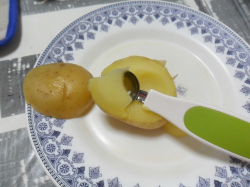 hacer un pure con el interior de la patata cocida y una cucharada de margarina o mantequilla