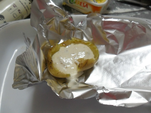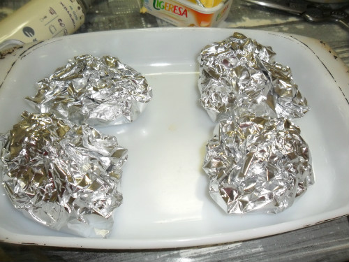 mientras se rellenan las patatas poner el horno a precalentar a 200º envolver las patatas con papel de aluminio para que se asen y no se desparrame la salsa, asarlas 20 minutos. Sacarlas, abrir los paquetes con cuidado para no quemeros y listas para comer