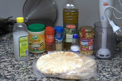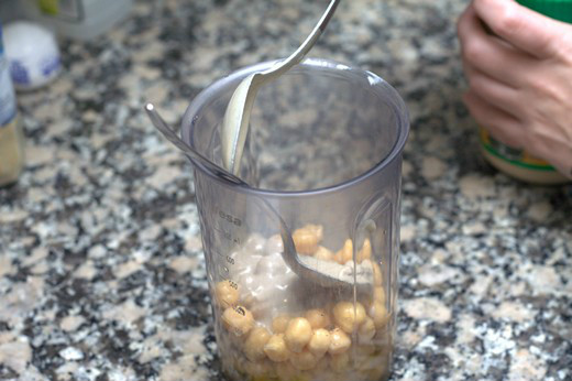 Introducir en el vaso de la batidora los garbanzos, la tahina, el aceite, el zumo de limón y el ajo bien picado.