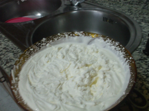 Motamos la nata con el azúcar, para que la nata monte bien tiene que estar muy fría casi congelada.