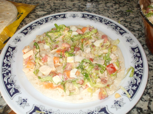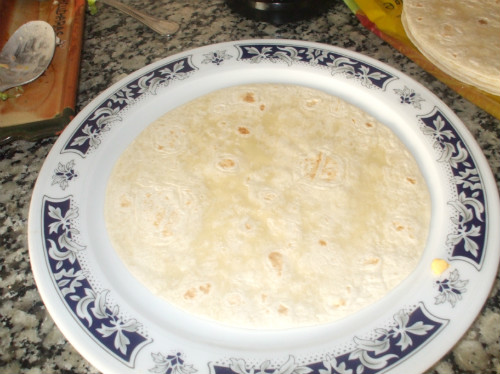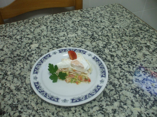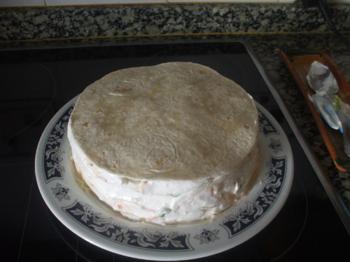 En un plato ponemos una fajita la cubrimos con el relleno, a continuación ponemos otra, así sucesivamente asta terminar con el relleno.