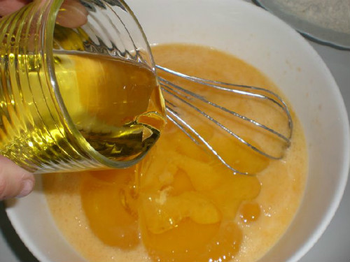 Se mezclan los siguientes ingredientes: huevos, aceite, azúcar, ralladura y zumo de naranja