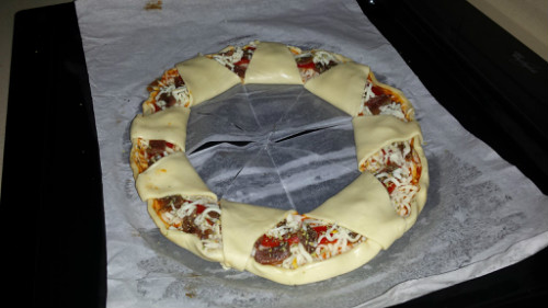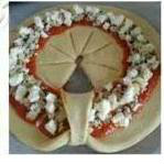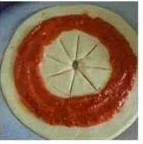 Hacer un círculo con el tomate frito en la base de la pizza; Poner el queso y añadir los ingredientes, (yo anchoas y pimientos del piquillo); hacer una marca en el centro de la pizza y cortar 8 triángulos como en la foto.