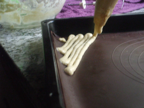 Montamos las yemas con el azúcar hasta que hallan triplicado su volumen, añadimos a las yemas la harina mezclada con la levadura y seguimos batiendo hasta que esten bien mezclado, agregamos a esta masa las claras montadas y lo intregramos con movimientos envolventes.