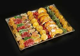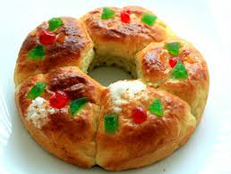 PINTA EL ROSCON CON EL HUEVO BATIDO Y REPARTE ENCIMA LAS FRUTAS ESCARCHADAS MEZCLA 70 GR DE AZUCAR GRAS Y UNAS GOTAS DE AGUA Y ESPOLVOREA EL ROSCON HORNEA A 200ºC DURANTE 30 MINUTOS