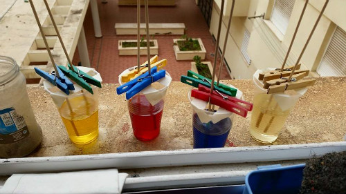MOJAMOS LOS PALOS DE BROCHETA EN EL ALMÍBAR DE COLOR QUE QUERAMOS Y MOJAMOS EN EL VASO DE AZÚCAR Y LO PONEMOS EN EL VASO CON EL ALMÍBAR CON CUIDADO. DEBE QUEDAR 1 CM. POR ENCIMA DEL FONDO Y SIN TOCAR LOS LATERARES. LOS SUSPENDEMOS CON LA AYUDA DE PINZAS O LO QUE TENGAMOS MÁS A MANO.