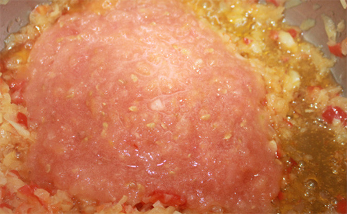 Rallamos la cebolla, picamos los ajos, y picamos el pimiento muy fino (si se desea se puede añadir pimiento morrón de lata). Ponemos el aceite en una sartén a fuego flojo, y rehogamos todo con un poco de sal, y otro de azúcar (una pizca). Lo hacemos unos 12 minutos, removiendo de vez en cuando.