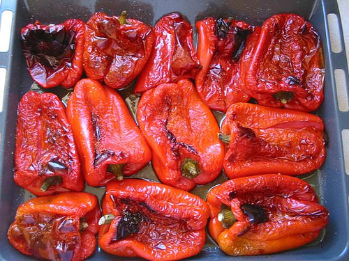 Precalentamos el horno a 180º (calor arriba y abajo). Mientras lavamos bien los pimientos, los secamos, y los ponemos en una fuente apta para horno con un chorreón de aceite. Horneamos más o menos 1 hora, dándole la vuelta cada 15 mins. La piel de los pimientos se tiene que poner negra, pero cuidando que no se nos quemen. Sacamos del horno, tapamos con un paño, y dejamos enfriar a temperatura ambiente.