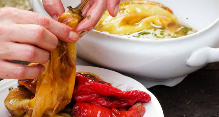 Pelamos los pimientos y quitamos las semillas. Los partimos a tiras, y los ponemos en un recipiente (a ser posible de barro). Reservamos los jugos.