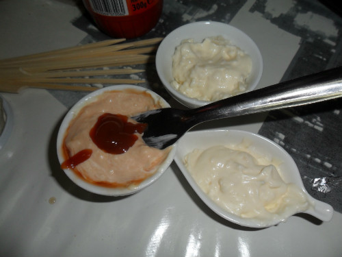 en uno de los platitos, echar el ketcup y mezclarlo bien, en otro añadir la cucharada de perejil y en el tercero cebollita muy picada