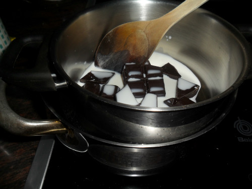 poner a derretir al baño maría el chocolate junto con el chorrito de leche, mover hasta que está fundido , añadir también el azúcar