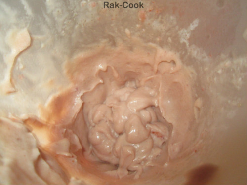 En el vaso de la batidora cortamos en trozos pequeños el queso, si es de Burgos, si es Mascarpone es muy cremoso, añadimos dos cucharadas del fresón colado, dos o tres cucharadas de azúcar (Un poco a gusto pero que no quede demasiado dulce, para 300 gr de queso serían unos 100 gr de azúcar) y nata o leche según vaya necesitando para que no quede excesivamente espeso. Vamos batiendo bien hasta obtener una mezcla espesa, no demasiado contundente, suave y cremosa.