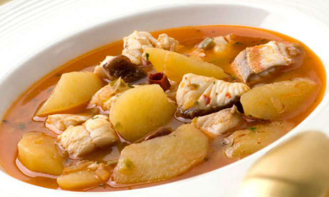 CASCA LAS PATATAS CUANDO LAS VERDURAS TOMEN COLOR AÑADELAS Y MEZCLA MOJA CON EL VINO Y CUBRE CON EL CALDO DE PESCADO COLADO INCORPORA LA CARNE DE PIMIENTO CHORICERO Y LA GUINDILLA COCIDA 15 MINUTOS