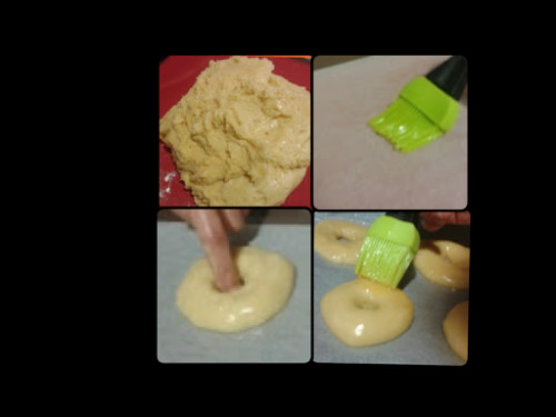 Para formar los rollos, vamos cogiendo porciones de masa de tamaño aproximado de una pelota de ping pong y la colocamos en la bandeja del horno con papel vegetal engrasado y con bastante espacio entre ellos, ya que al hornearse doblan su volumen .De forma tradicional con el dedo presionamos en el centro y giramos haciendo el agujero y dándole la forma.