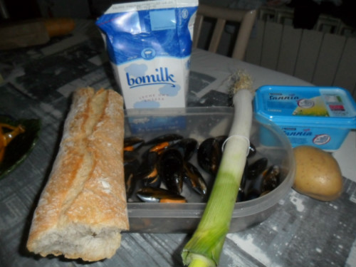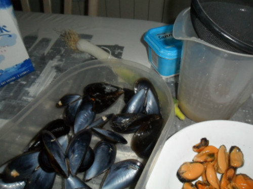 preparar los ingredientes, lavar los mejillones y abrirlos al fuego con un vaso de agua